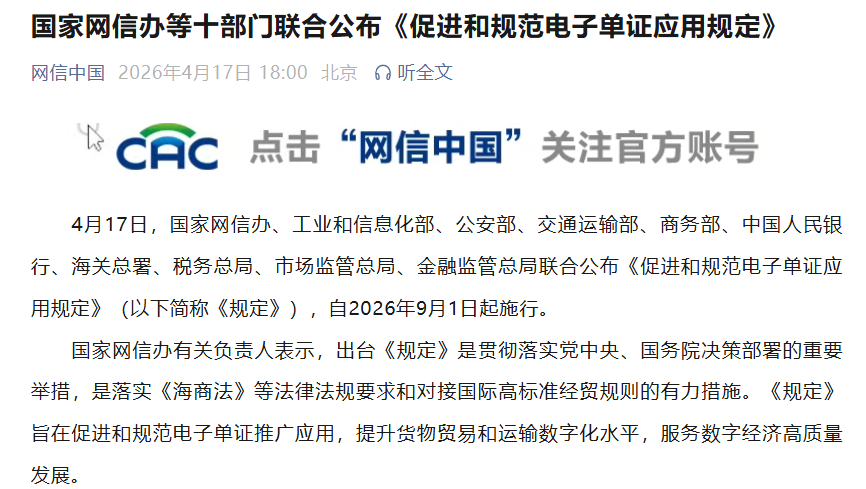 中國網4月17日訊 據(jù)網信中國微信公眾號消息,4月17日,國家網信辦、工業(yè)和信息化部、公安部、交通運輸部、商務部、中國人民銀行、海關總署、稅務總局、市場監(jiān)管總局、金融監(jiān)管總局聯(lián)合公布《促進和規(guī)范電子單證應用規(guī)定》(以下簡稱《規(guī)定》),自2026年9月1日起施行。