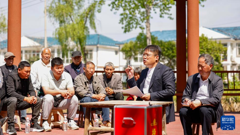 4月19日,泗洪縣上塘鎮(zhèn)墊湖村黨委書記周磊(右二)向村民代表介紹今年擬辦的民生實(shí)事。