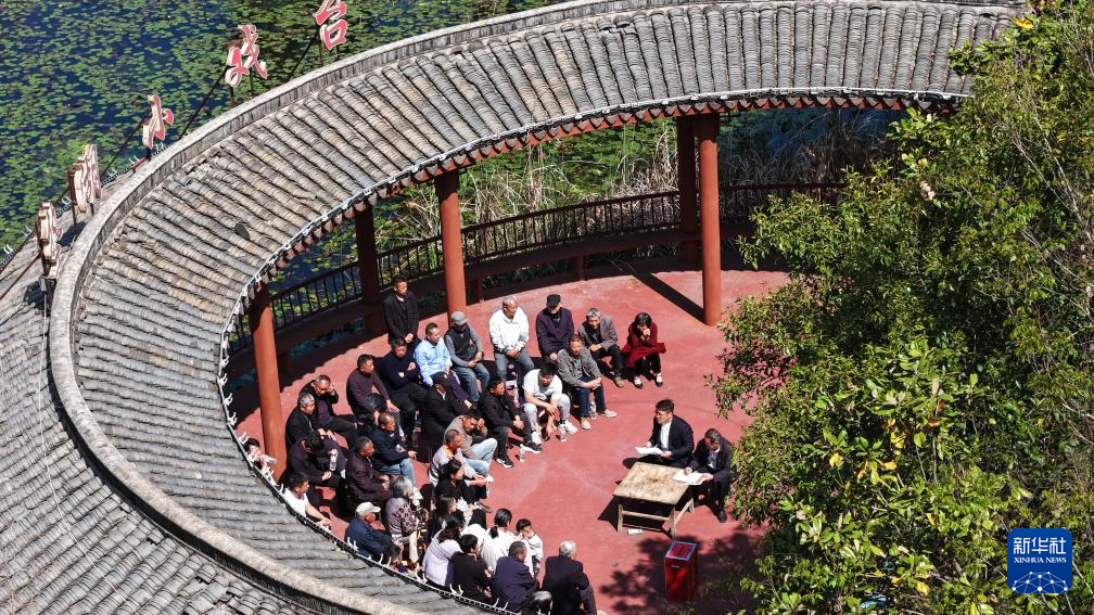 4月19日拍攝的泗洪縣上塘鎮(zhèn)墊湖村村民代表票決民生實(shí)事現(xiàn)場(無人機(jī)照片)。