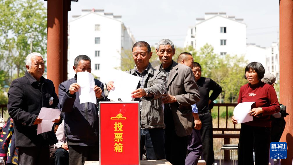 4月19日,泗洪縣上塘鎮(zhèn)墊湖村村民代表往票箱里投放民生實(shí)事表決表。