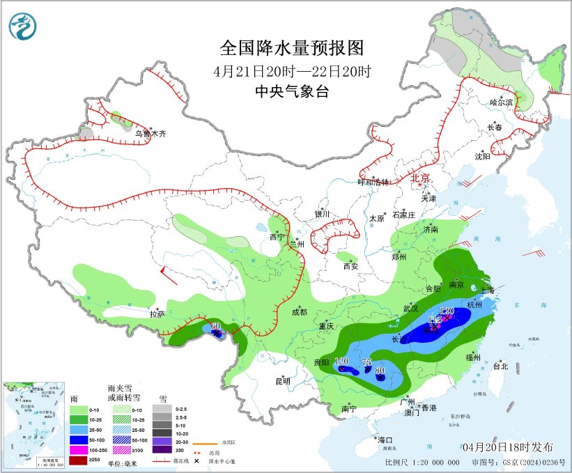 4月20日20時(shí)至21日20時(shí),內(nèi)蒙古東北部、黑龍江西北部、新疆沿天山地區(qū)、青海中部和東北部、甘肅河西等地部分地區(qū)有小雪或雨夾雪,其中,內(nèi)蒙古東北部、黑龍江西北部等地部分地區(qū)有中到大雪(5~8毫米)。西北地區(qū)東南部、黃淮西部、江漢東部、江南大部、四川盆地東北部、華南西部、北部和東南部等地部分地區(qū)有中到大雨,其中,湖南南部和東部、江西中北部、廣西東北部等地部分地區(qū)有暴雨,局地大暴雨(100~160毫米)。內(nèi)蒙古中東部、吉林、黑龍江東南部以及新疆南疆盆地、西藏北部、青海中西部等地部分地區(qū)有5~7級風(fēng),陣風(fēng)8~9級,其中內(nèi)蒙古中部、吉林中東部等地局地有8~9級風(fēng),陣風(fēng)10級以上;渤海、渤海海峽、黃海北部部分海域?qū)⒂?級、陣風(fēng)8級的大風(fēng)(見圖3)。