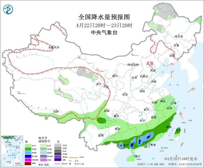 4月22日20時(shí)至23日20時(shí),內(nèi)蒙古東北部、黑龍江西北部、青藏高原北部、甘肅河西等地部分地區(qū)有小雪或雨夾雪。江南東部和南部、華南中南部等地部分地區(qū)有中到大雨,其中,廣西東南部、廣東西部和北部等地部分地區(qū)有暴雨或大暴雨(100~110毫米)。內(nèi)蒙古大部、遼東半島、山東半島、甘肅河西、青藏高原等地部分地區(qū)有4~6級風(fēng)。東海北部海域?qū)⒂?~8級大風(fēng)、陣風(fēng)9級;黃海南部海域、東海南部海域、臺灣海峽、臺灣以東洋面、北部灣將有5~6級大風(fēng)、陣風(fēng)7級(見圖5)。