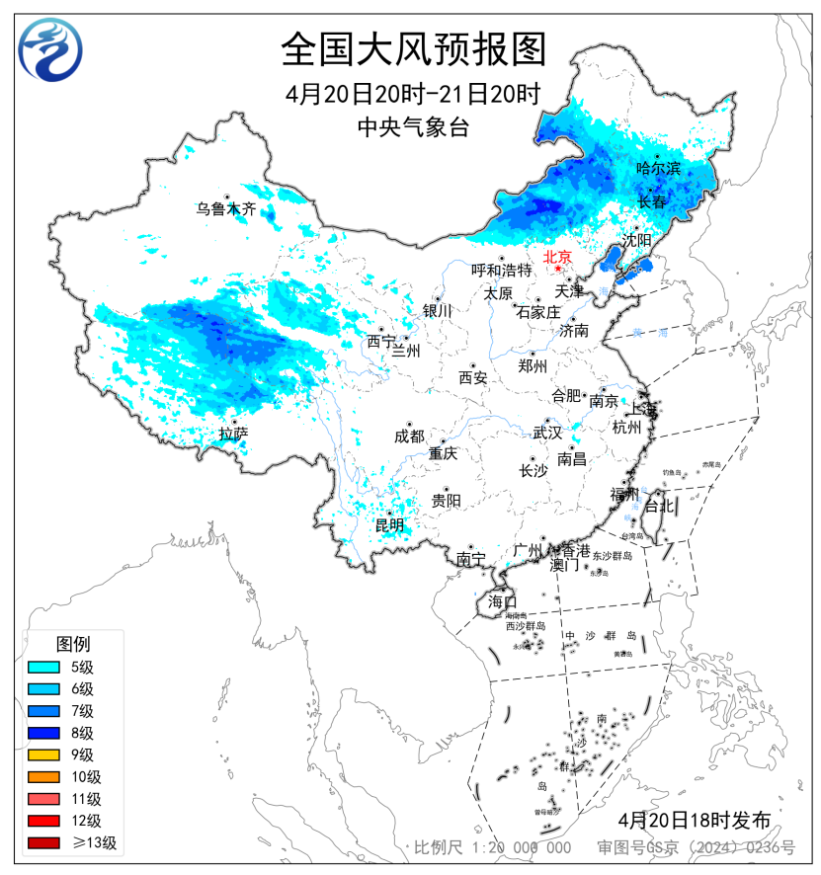 預(yù)計(jì)4月20日20時(shí)至21日20時(shí),內(nèi)蒙古中東部、吉林、黑龍江東南部以及新疆南疆盆地、西藏北部、青海中西部等地部分地區(qū)有5~7級風(fēng),陣風(fēng)8~9級,其中內(nèi)蒙古中部、吉林中東部等地局地有8~9級風(fēng),陣風(fēng)10級以上;渤海、渤海海峽、黃海北部部分海域?qū)⒂?級、陣風(fēng)8級的大風(fēng)(見圖2)。中央氣象臺4月20日18時(shí)發(fā)布大風(fēng)藍(lán)色預(yù)警。