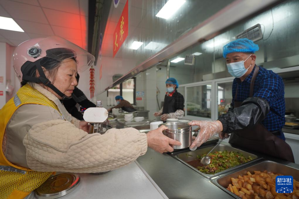 在揚(yáng)州市廣陵區(qū)汶河街道社區(qū)食堂內(nèi),身為“幸福食堂合伙人”的工作人員(右)為居民打飯(4月17日攝)。