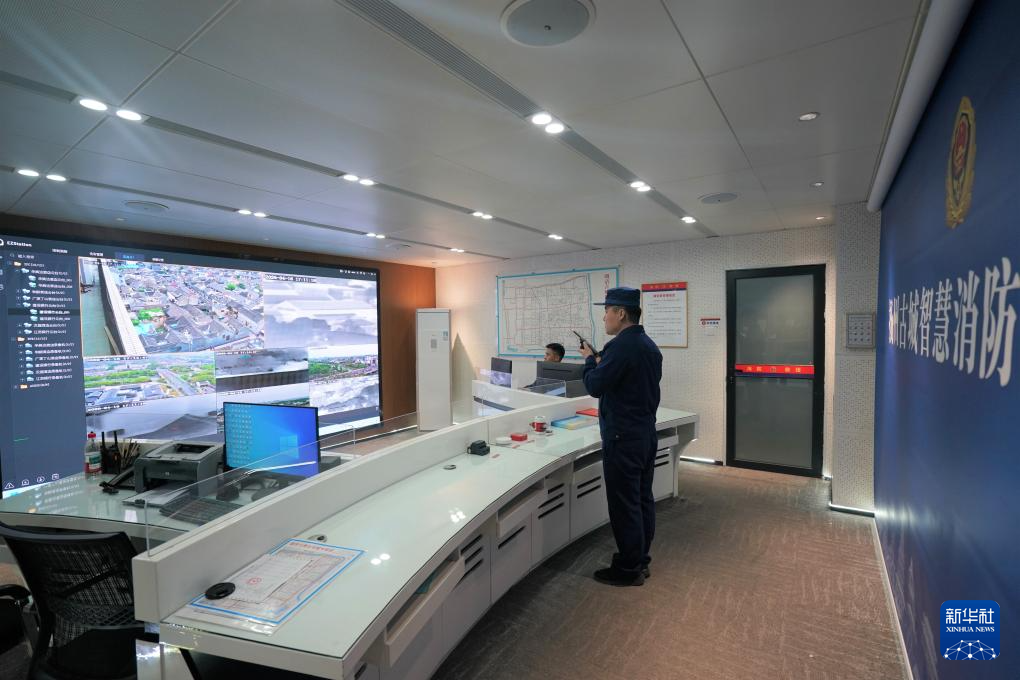 在揚(yáng)州市廣陵區(qū)東關(guān)街政府專職消防隊(duì)指揮中心,“協(xié)同治理合伙人”張華峰依托“古城智慧消防監(jiān)管系統(tǒng)”開展古城街區(qū)消防實(shí)況監(jiān)測(cè)和現(xiàn)場(chǎng)指揮(4月16日攝)。