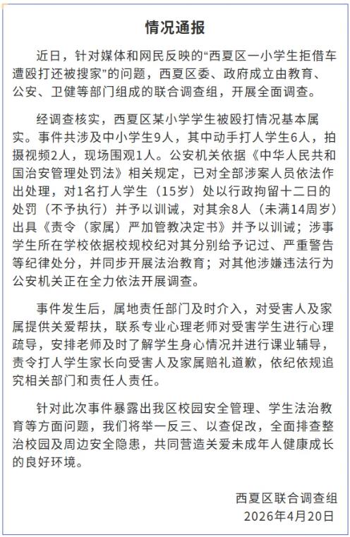 經(jīng)調(diào)查核實,西夏區(qū)某小學學生被毆打情況基本屬實。事件共涉及中小學生9人,其中動手打人學生6人,拍攝視頻2人,現(xiàn)場圍觀1人。公安機關(guān)依據(jù)《中華人民共和國治安管理處罰法》相關(guān)規(guī)定,已對全部涉案人員依法作出處理,對1名打人學生(15歲)處以行政拘留十二日的處罰(不予執(zhí)行)并予以訓(xùn)誡,對其余8人(未滿14周歲)出具《責令(家屬)嚴加管教決定書》并予以訓(xùn)誡;涉事學生所在學校依據(jù)校規(guī)校紀對其分別給予記過、嚴重警告等紀律處分,并同步開展法治教育;對其他涉嫌違法行為公安機關(guān)正在全力依法開展調(diào)查。