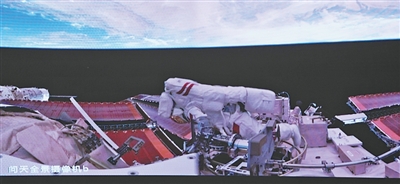 在北京航天飛行控制中心屏幕上拍攝的陳中瑞在空間站組合體艙外工作畫(huà)面。新華社記者 厲彥辰攝
