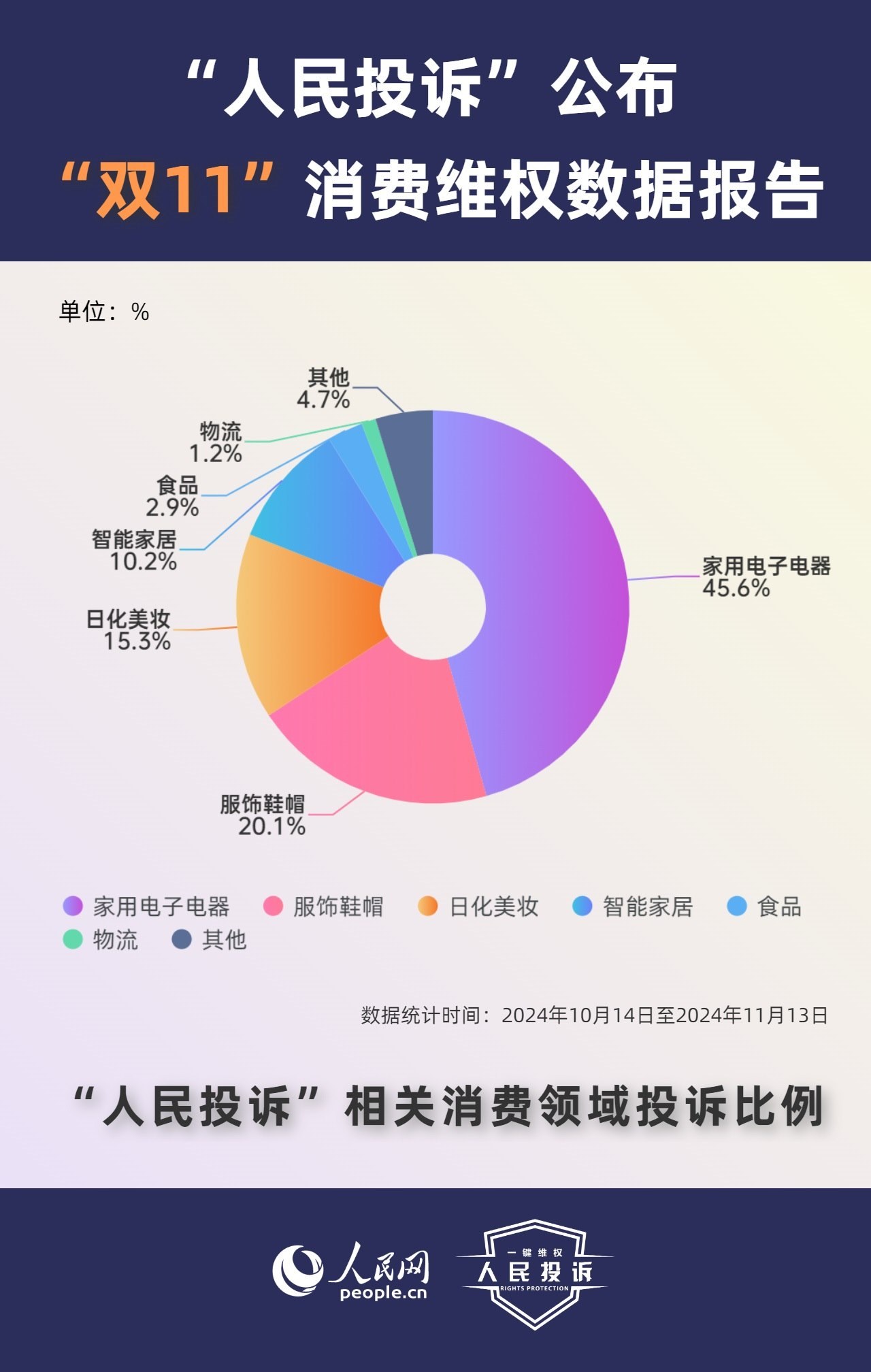 那么,今年你的“雙11”購(gòu)物還遇到了哪些“套路”?據(jù)人民網(wǎng)“人民投訴”平臺(tái)統(tǒng)計(jì),“雙11”期間平臺(tái)共收到17699條(數(shù)據(jù)統(tǒng)計(jì)從2024年10月14日-11月13日)投訴信息。其中,手機(jī)、家電、智能產(chǎn)品、美妝服飾等消費(fèi)領(lǐng)域維權(quán)量大;平臺(tái)“國(guó)補(bǔ)”“以舊換新”等優(yōu)惠規(guī)則不透明,保價(jià)服務(wù)藏“貓膩”,直播間虛假“破價(jià)”,“百億補(bǔ)貼”商品貨不對(duì)板,“高價(jià)預(yù)售”欺詐等問(wèn)題反映突出。