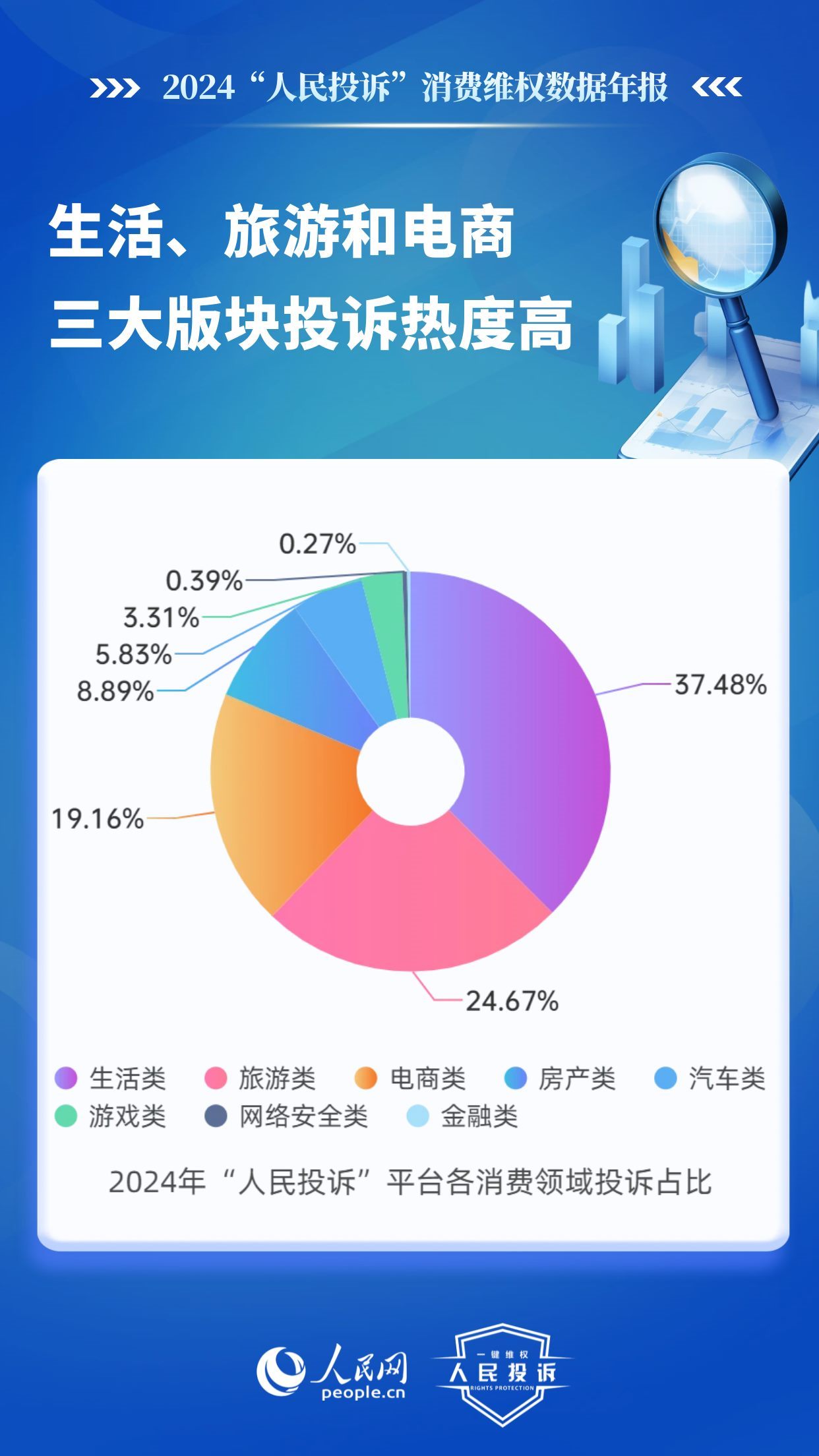據(jù)統(tǒng)計,在網(wǎng)友投訴的消費重點領(lǐng)域,生活類占比37.48%、旅游類24.67%、電商類19.16%、房產(chǎn)類8.89%、汽車類5.83%、游戲類3.31%、網(wǎng)絡(luò)安全類0.39%、金融類0.27%。其中,生活、旅游和電商三大版塊投訴熱度較高。