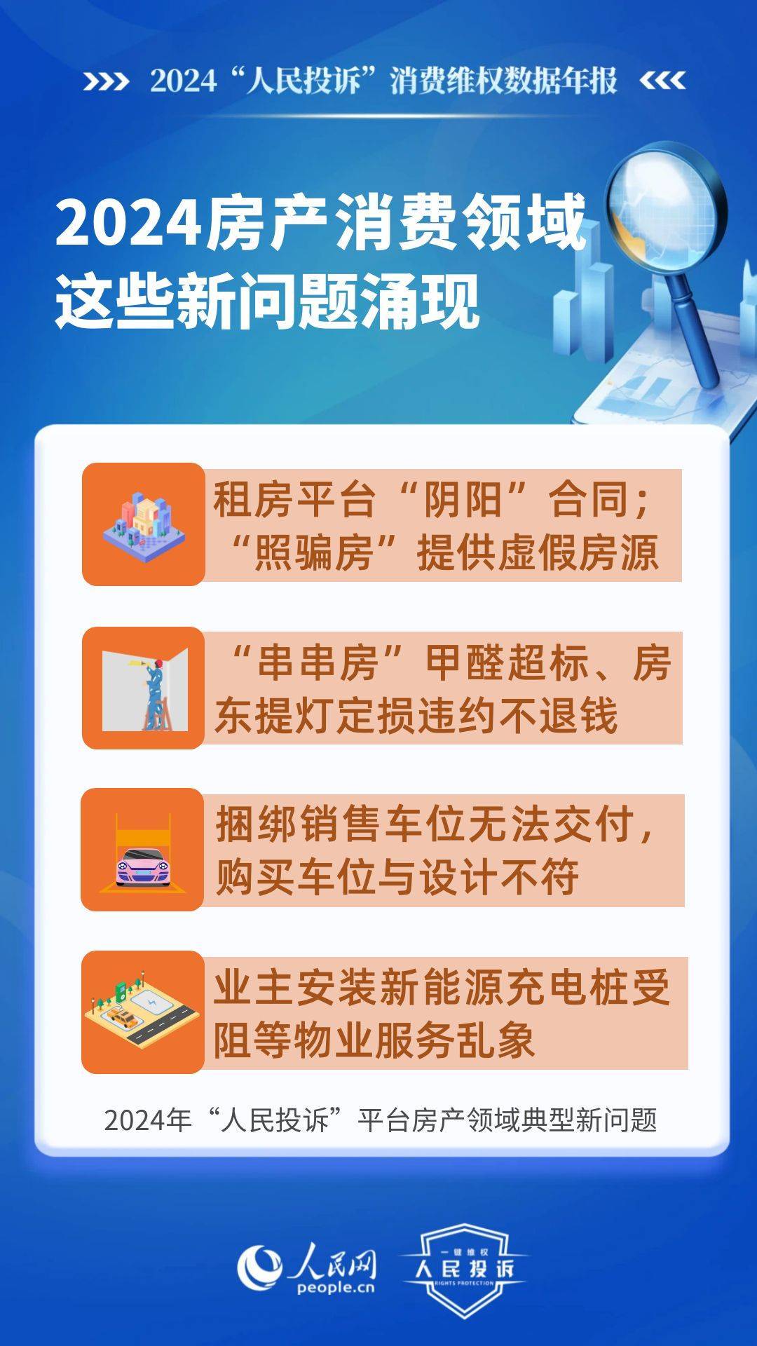 新問題體現(xiàn)在:租房平臺“陰陽”合同、提供虛假房源、甲醛超標不退款、違約不退定金/押金等;捆綁銷售車位無法交付,購買車位與設(shè)計不符,人防車位/不合格機械車位當普通車位賣,無法正常使用,業(yè)主安裝充電樁受阻等。