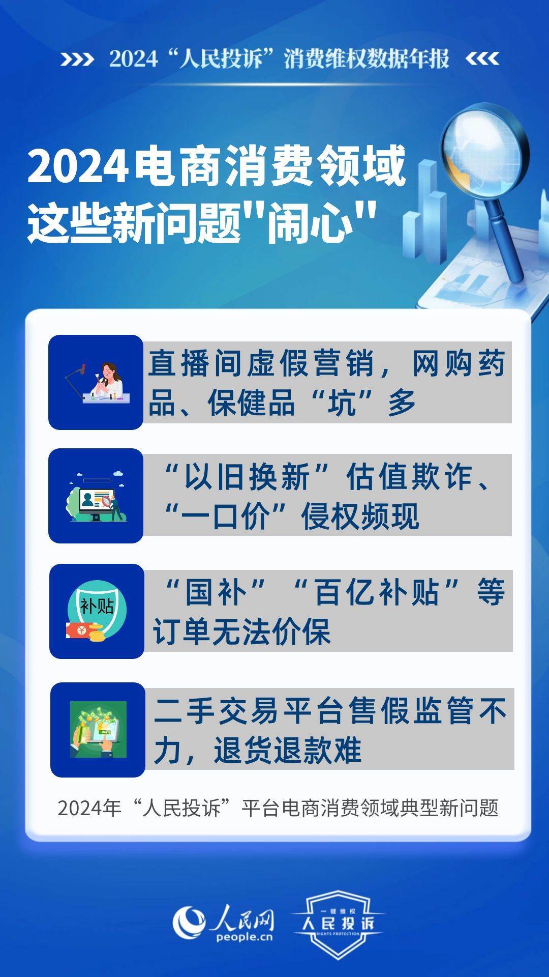 新問題體現(xiàn)在:直播間虛假營銷,購買玉石/網(wǎng)課/旅游產(chǎn)品等消費“踩雷”多;“以舊換新”估值欺詐、“一口價”侵權(quán)頻現(xiàn);“國補”“百億補貼”訂單不給價保;二手交易平臺對商家售假監(jiān)管不力、“陰陽”檢測、退貨退款難;網(wǎng)購藥品/保健品/醫(yī)療器械“坑”多等。