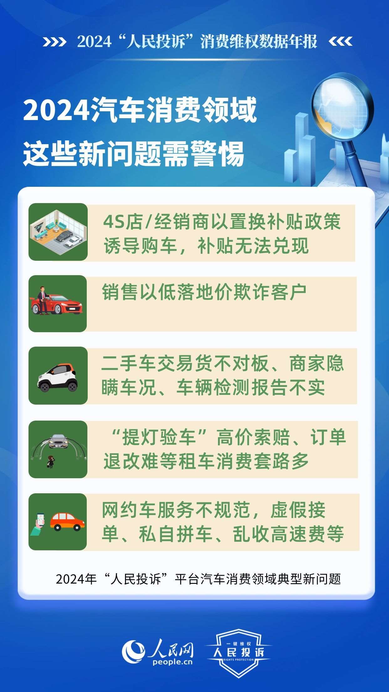 新問題體現(xiàn)在:4S店/經(jīng)銷商以置換補貼政策誘導(dǎo)購車,結(jié)果補貼無法兌現(xiàn);銷售以低落地價欺詐客戶;二手車交易貨不對板、商家隱瞞車況、平臺車輛檢測報告不實;惡意租“故障車”、“提燈驗車”高價索賠、低價誘租、訂單退改難等租車消費套路多;網(wǎng)約車服務(wù)不規(guī)范,人車不符、虛假接單、私自拼車、亂收高速費等。
