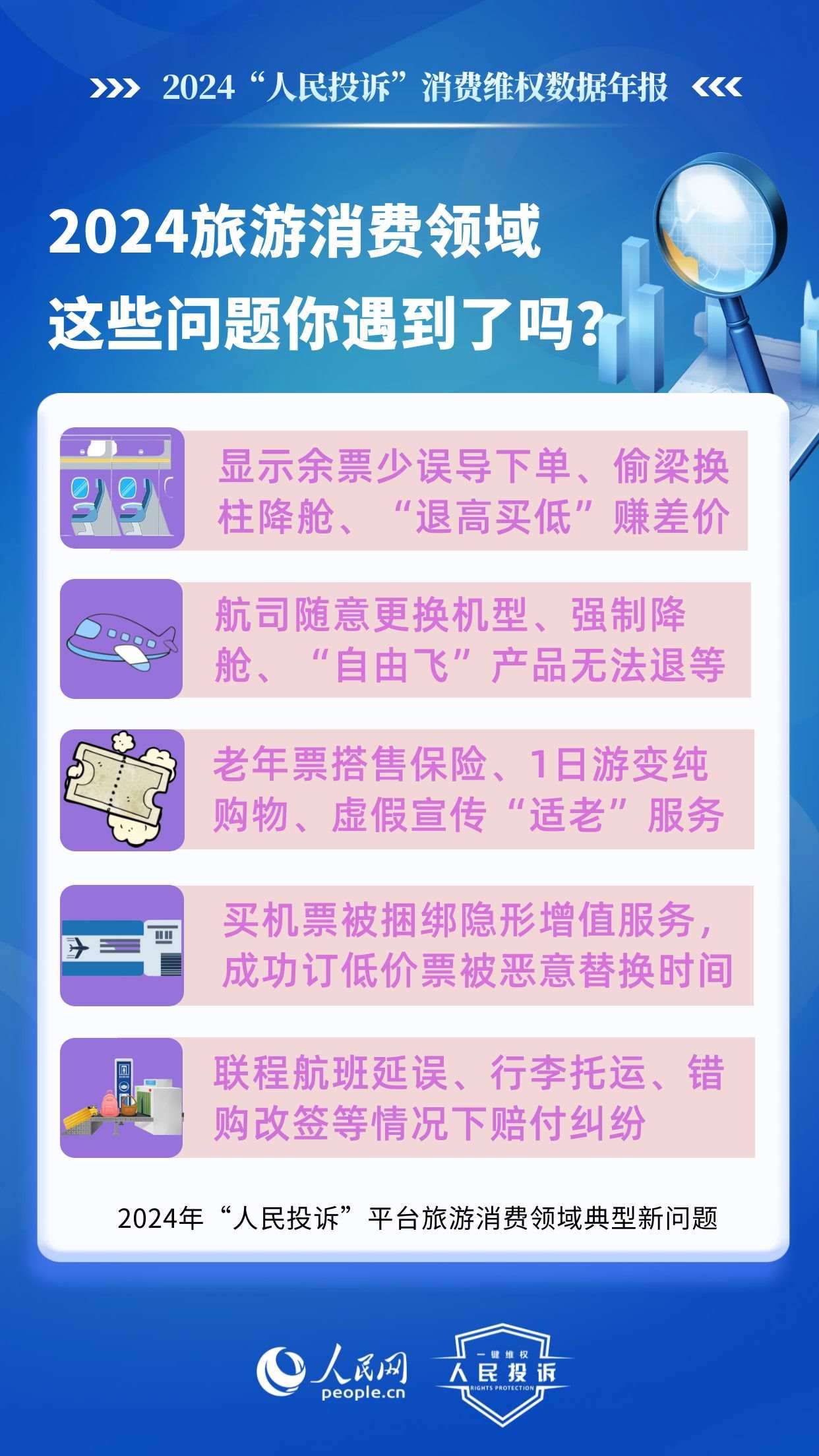 2024年,旅游消費持續(xù)火爆,以舊換新“換”出消費新活力,直播電商“品質(zhì)化”轉(zhuǎn)型,新能源汽車購銷兩旺……在消費市場熱力持續(xù)提升的背景下,旅游產(chǎn)品退訂難,電商促銷虛假價保,直播間營銷違規(guī),車險車貸服務(wù)欺詐,AI培訓(xùn)貨不對板等消費侵權(quán)問題引發(fā)廣泛關(guān)注。“人民投訴”發(fā)布年報帶您回顧這一年來,平臺消費維權(quán)熱點和入駐企業(yè)積極處理糾紛的舉措。