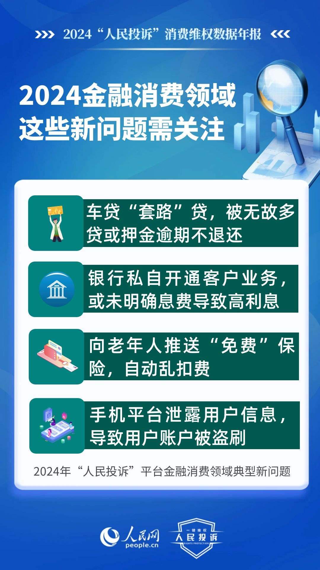 新問題體現(xiàn)在:車貸“套路”貸,被無故多貸或押金逾期不退還;銀行私自開通客戶銀行卡業(yè)務(wù),或未向客戶明確息費導(dǎo)致高額利息;小程序誘導(dǎo)充值后提現(xiàn)欺詐;支付平臺向老年人推送“免費”保險,自動亂扣費;手機平臺泄露用戶信息,導(dǎo)致用戶賬戶被盜刷、微信錢包被自動扣款等;跨境電商運營App誘導(dǎo)高額充值后無法提現(xiàn)、不退款等。