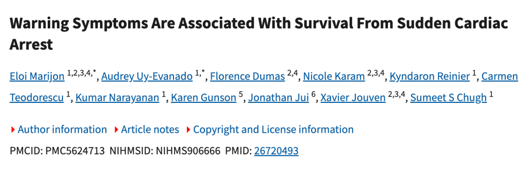 2016《內(nèi)科學(xué)年鑒》刊發(fā)的一篇文章,首次大規(guī)模證實心臟驟停前存在可識別的預(yù)警癥狀,打破了“猝死毫無征兆”的傳統(tǒng)認知。研究納入的839名心臟驟停患者中,430名有先兆癥狀,占51%,主要為:胸痛、呼吸困難、頭暈。①
