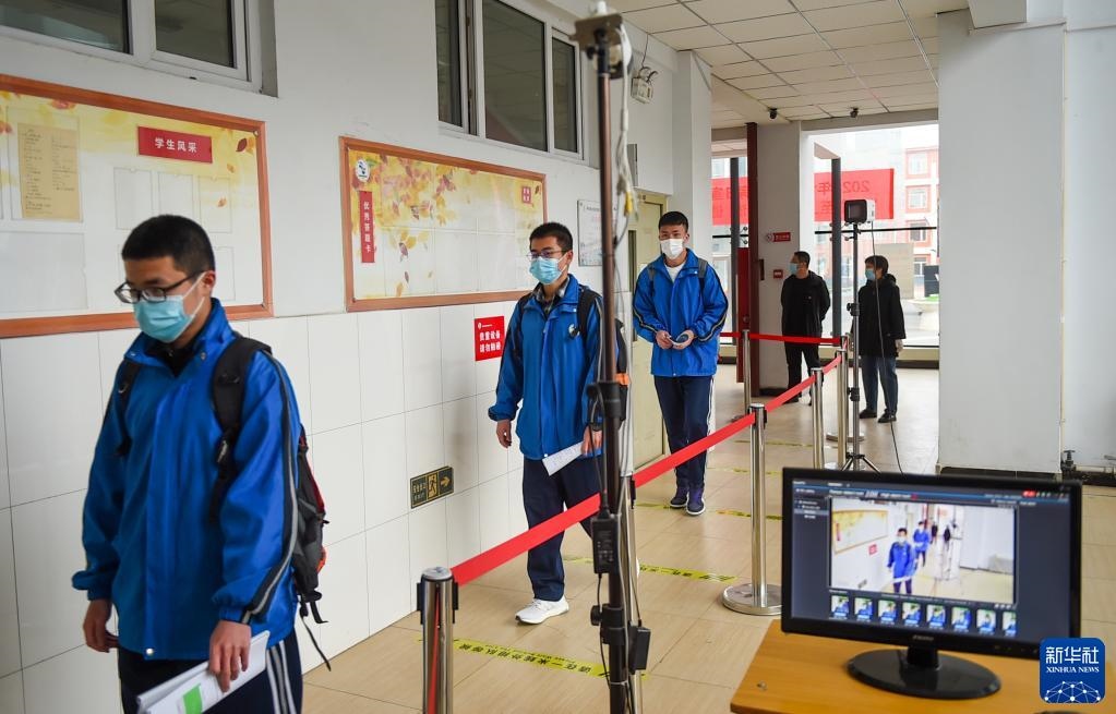 4月1日,高三年級(jí)學(xué)生走進(jìn)呼和浩特市鐵路第二中學(xué)教學(xué)樓,體溫檢測設(shè)備查驗(yàn)學(xué)生體溫。