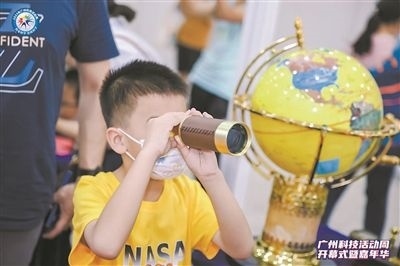 小學生使用望遠鏡觀察物體。廣州科技活動周主辦方供圖