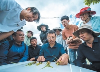 科技創(chuàng)新中國(guó)工程院院士張福鎖(中)和科技小院學(xué)生、農(nóng)民一起探討中稻種植技術(shù)。趙 渝攝(人民視覺(jué))