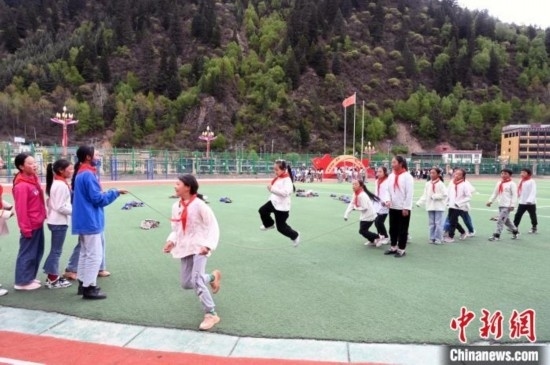 5月17日,四川阿壩州壤塘縣寄宿制學校的學生在操場跳繩。中新社記者 安源 攝