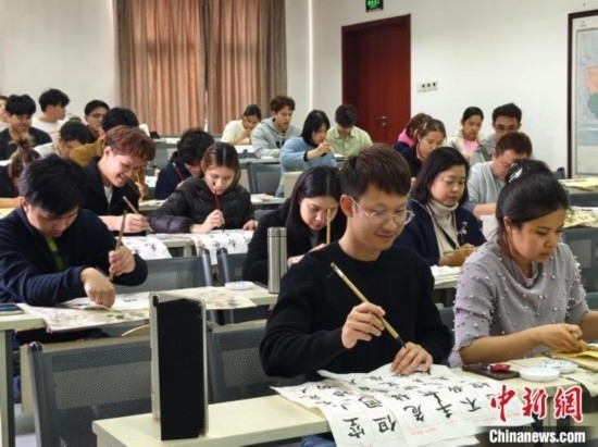 4月3日,在北京華文學(xué)院學(xué)習(xí)的泰國學(xué)員在上書法課。(中新網(wǎng)記者韓輝 攝)