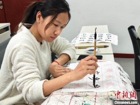 4月3日,在北京華文學(xué)院參加中文學(xué)習(xí)班的泰國學(xué)員吳嘉莉正在練習(xí)書法。(中新網(wǎng)記者韓輝 攝)