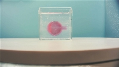 “嗡嗡嗡……”30厘米見方的操作臺上,一根3D打印針頭扎進(jìn)透明“果凍”中,針口處不斷擠出一根“紅線”,在“果凍”中沿著電腦規(guī)劃好的路線來回移動“作畫”。當(dāng)針頭自下而上移動到“果凍”上端時,只要按下暫停鍵,再將一層新“果凍”疊加到舊“果凍”上面,針頭又開始“畫”起來。最終,一顆高約6.5厘米的紅色心形3D模型被僅有1.27厘米長的小針頭精準(zhǔn)打印出來。