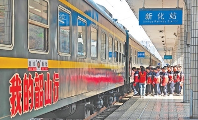 伴著汽笛長鳴,一列紅色研學(xué)專列駛進韶山站。這是中國鐵路廣州局集團有限公司推出的“我的韶山行”紅色研學(xué)專列。車廂內(nèi),“乘風(fēng)破萬卷,追風(fēng)正少年”標(biāo)語引人注目。打造“書香列車”主題車廂,在餐車設(shè)立“書香驛站”,將吧臺改造成“陽光書社”,設(shè)計留言帖、主題打卡點,發(fā)放文創(chuàng)紀(jì)念票卡……列車寓學(xué)于途,開設(shè)韶山站現(xiàn)場教學(xué)點,打造火車上的流動課堂。