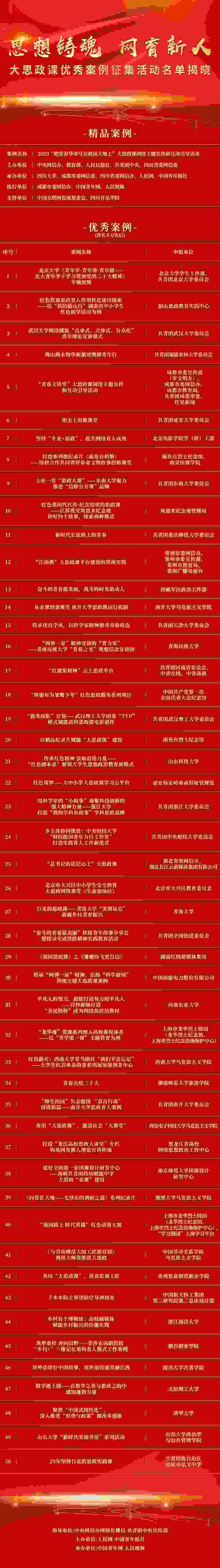 人民網(wǎng)北京2月10日電 (記者王鑫)由中央網(wǎng)信辦網(wǎng)絡傳播局、共青團中央宣傳部指導,人民網(wǎng)、中國青年報社共同主辦的“思想鑄魂 網(wǎng)育新人”大思政課優(yōu)秀案例征集活動評選今天揭曉結(jié)果,經(jīng)初選、終選以及結(jié)果公示,產(chǎn)生精品案例1件、優(yōu)秀案例50件,名單如下: