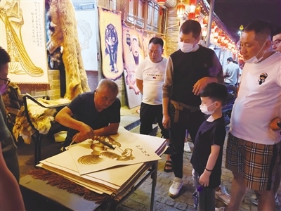在老街上一些具有民族特色的皮畫店、皮包店也成為了人們駐足消費、觀賞的熱點商鋪。在一家皮畫店,皮畫師在現(xiàn)場制作皮畫,看著精美的圖案被皮畫師一筆一筆地勾勒出來,不少市民都忍不住停下腳步?!皫Ш⒆映鰜黹e逛,看到皮畫孩子主動提出來要看,皮畫是咱們呼市特有的,現(xiàn)場制作,能讓更多人了解制作過程,了解皮畫,挺好的?!笔忻裰芟壬f。