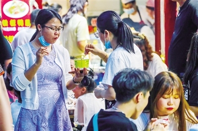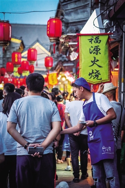 6月7日正值周日,夜幕還未降臨,大召廣場上已經(jīng)聚集了不少消遣的市民,他們當中有六七十歲的老人,也有二三十歲的青年,還有牽著父母手的孩童。隨著時間的推移,廣場上的人越來越多,而緊挨著廣場的通順大巷更是人頭攢動,吆喝聲、叫賣聲、談笑聲、音樂聲混在一起,形成了夏季獨有的市井之聲。街上,從本地的稀果羹、羊肉串、烤面筋到北京爆肚、武漢臭豆腐可謂應有盡有,家家戶戶的門前都或多或少的有市民排隊等候。