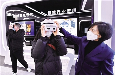 1月19日,參觀者在內(nèi)蒙古5G產(chǎn)業(yè)創(chuàng)新基地體驗5GVR頭盔。當(dāng)日,由內(nèi)蒙古和林格爾新區(qū)攜手電信、移動、聯(lián)通、鐵塔、華為建設(shè)的全區(qū)首個“內(nèi)蒙古5G產(chǎn)業(yè)創(chuàng)新基地”在和林格爾新區(qū)正式揭牌。該基地的投用標(biāo)志著和林格爾新區(qū)在打造數(shù)字產(chǎn)業(yè)平臺、集聚5G產(chǎn)業(yè)生態(tài)、推廣5G應(yīng)用創(chuàng)新方面又取得了新突破。(記者 王磊 攝)