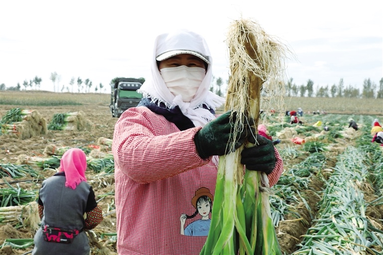 正在忙著收蔥打捆的村民于新穎說:“看這蔥長得多好!”