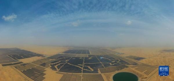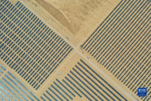 一匹占地130多萬平方米的沙漠“駿馬”橫臥在內(nèi)蒙古自治區(qū)庫布其沙漠之中,這是位于達拉特光伏發(fā)電應用領跑基地中、由近20萬塊光伏板組成的“駿馬電站”。該電站采用“林光互補”模式,板上發(fā)電、板下種植,在開發(fā)利用庫布其沙漠豐富太陽能資源的同時,推動沙漠生態(tài)治理。