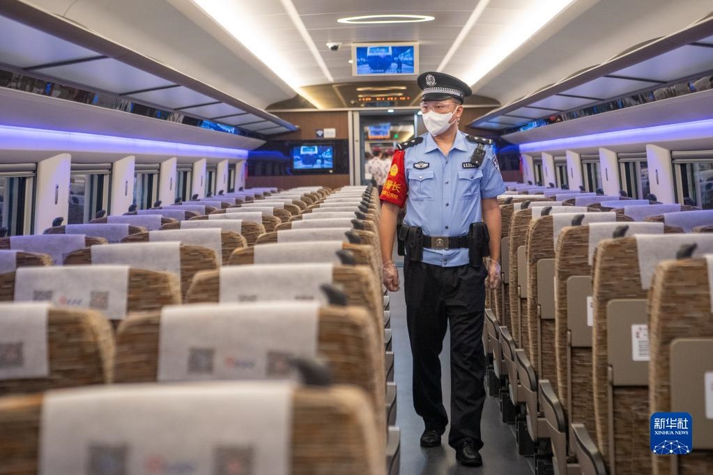 6月19日,鐵路公安在首發(fā)列車CR400AF復(fù)興號(hào)動(dòng)車組上進(jìn)行巡檢作業(yè)。新華社記者 唐奕 攝