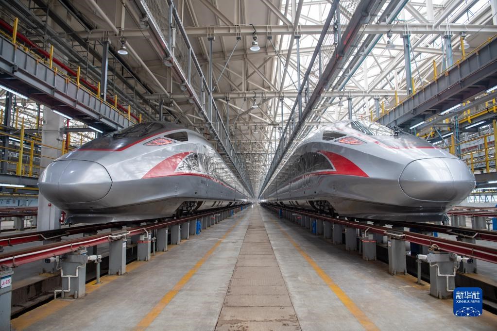 6月19日,鄭渝高鐵全線開(kāi)通運(yùn)營(yíng)重慶首發(fā)列車CR400AF復(fù)興號(hào)動(dòng)車組(左)在重慶車輛段西動(dòng)車所亮相。新華社記者 唐奕 攝