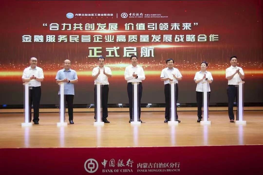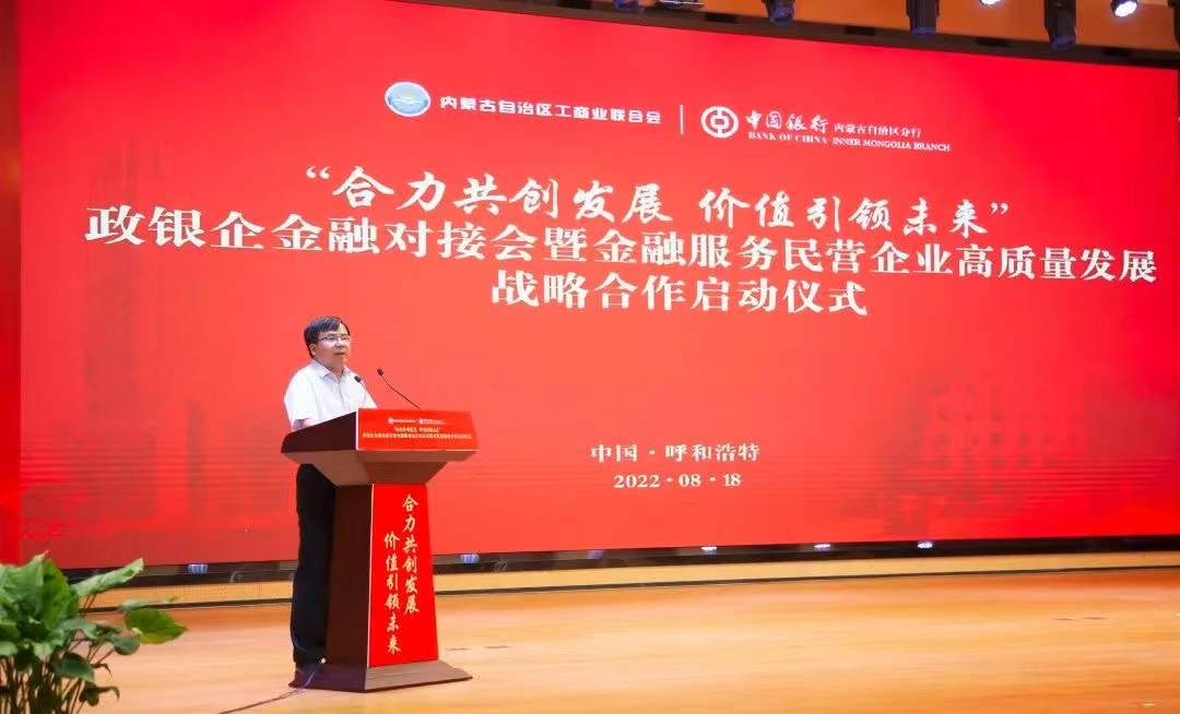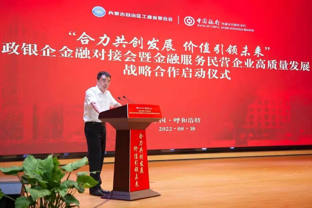 8月18日,中國銀行內(nèi)蒙古自治區(qū)分行與內(nèi)蒙古自治區(qū)工商業(yè)聯(lián)合會“合力共創(chuàng)發(fā)展 價值引領未來”政銀企金融對接會暨金融服務民營企業(yè)高質(zhì)量發(fā)展戰(zhàn)略合作啟動儀式在呼和浩特舉行。自治區(qū)政協(xié)副主席、工商業(yè)聯(lián)合會主席安潤生,自治區(qū)工商業(yè)聯(lián)合會提名副主席溫殿龍,中國銀行內(nèi)蒙古自治區(qū)分行黨委書記、行長胡文勇,中國銀行內(nèi)蒙古自治區(qū)分行黨委委員、副行長雲(yún)雯妍出席活動。自治區(qū)工商業(yè)聯(lián)合會相關部門以及行業(yè)協(xié)會、商會、企業(yè)代表,中國銀行內(nèi)蒙古自治區(qū)分行相關部門及直屬支行負責人參加活動。