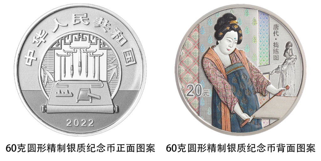 一枚60克圓形銀質(zhì)紀念幣背面圖案為《搗練圖》中縫紉、煽火造型,襯以裝飾紋樣組合設(shè)計,并刊“唐代·搗練圖”字樣及面額。