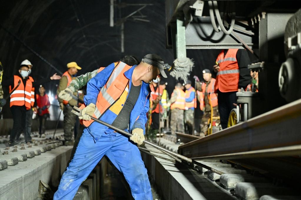 建設(shè)者們?cè)谕瓿扇€鋼軌的最后鋪架。(中國(guó)鐵路成都局集團(tuán)公司供圖)