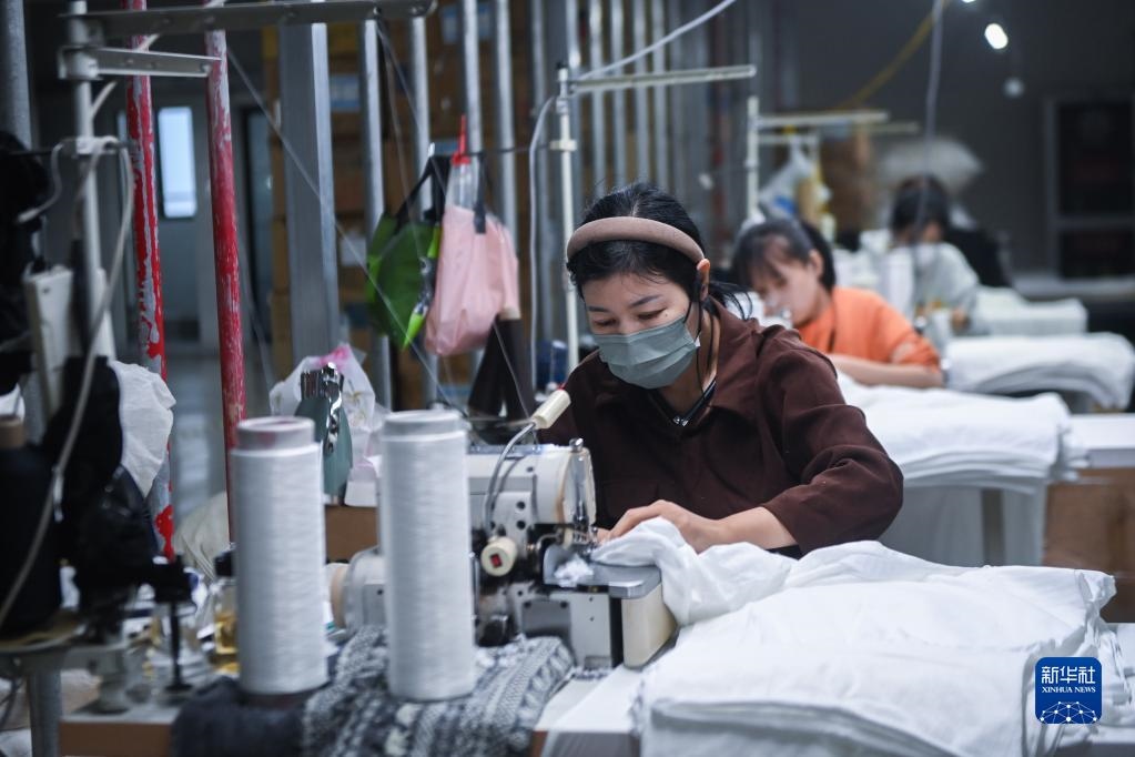 10月27日,在浙江省諸暨市大唐街道的一家專業(yè)生產(chǎn)拉絨打底褲產(chǎn)品的企業(yè)車間內(nèi),工作人員在加工拉絨打底褲。新華社記者 徐昱 攝