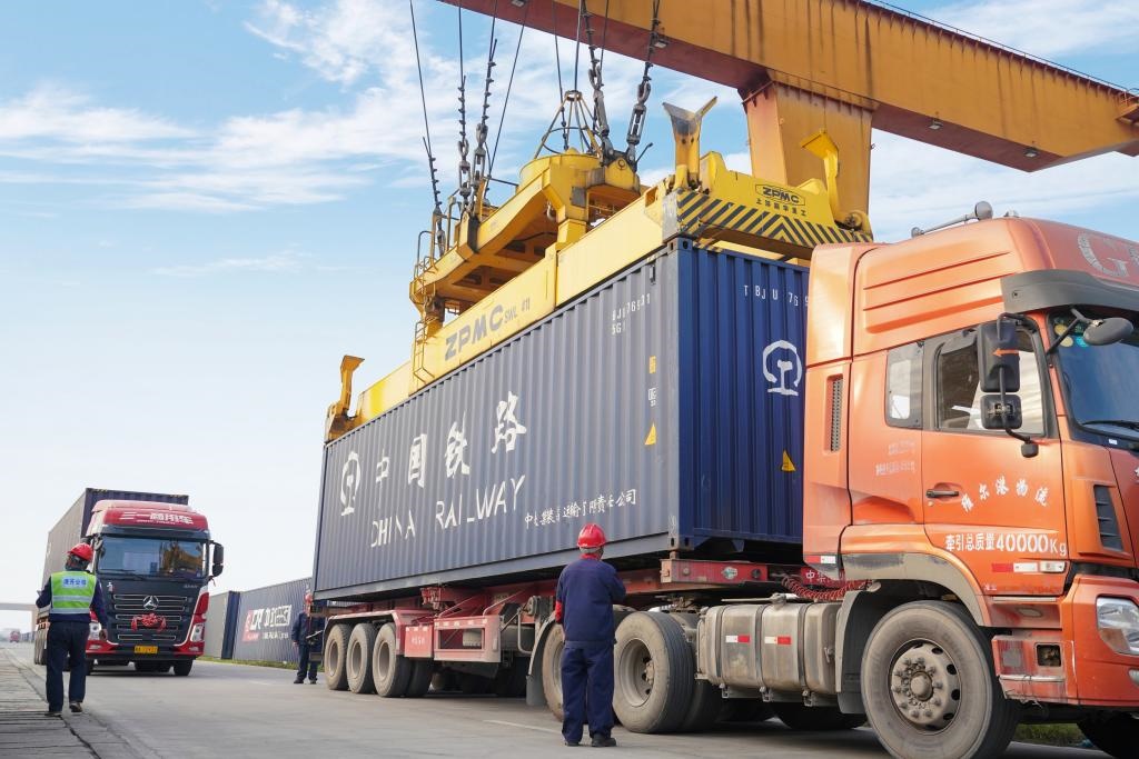 圖為南寧國際鐵路港內(nèi)集裝箱吊裝運輸作業(yè)現(xiàn)場。(中國鐵路南寧局集團有限公司供圖)