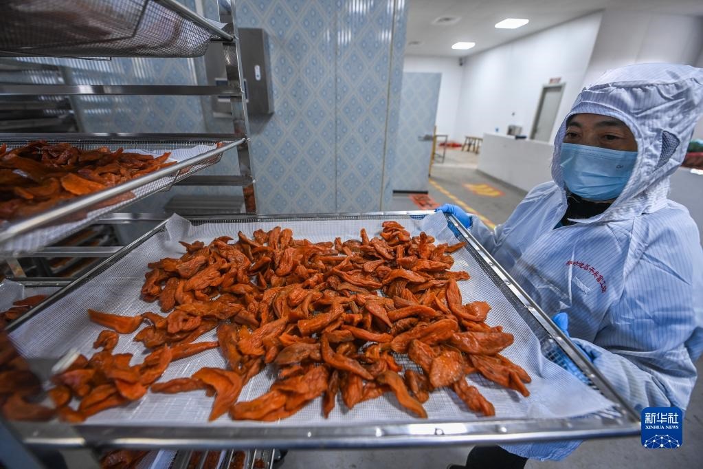 11月23日,在浙江省建德市更樓街道橋嶺村共富工坊的工作人員在碼放剛剛從烘箱里拿出來的地瓜干。新華社記者 徐昱 攝