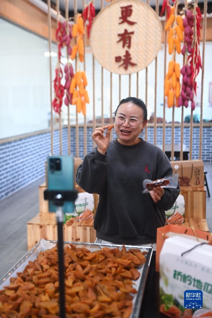 11月23日,黨員志愿者在浙江省建德市更樓街道橋嶺村共富工坊的直播間里進行網(wǎng)上直播銷售地瓜干。新華社記者 徐昱 攝