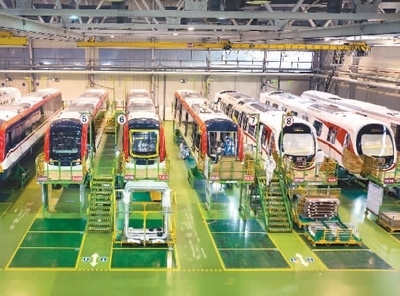 2023年2月14日,湖南省中車株洲電力機車有限公司城軌事業(yè)部總成車間,技術(shù)人員在加緊組裝城軌車輛,趕制國內(nèi)外客戶訂單。李 健攝(人民圖片)