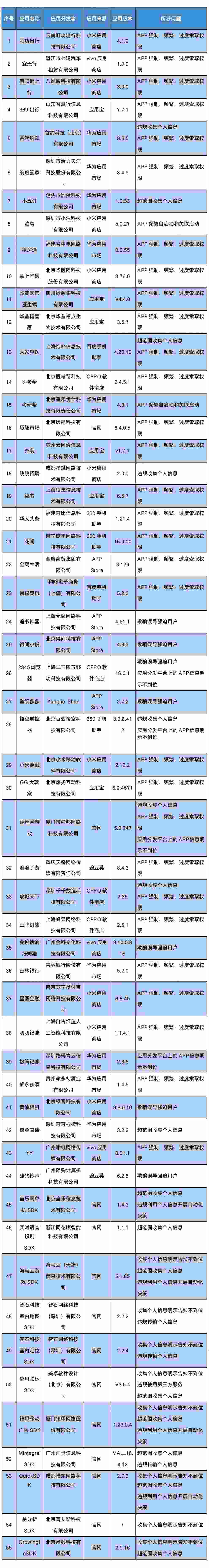 人民網(wǎng)北京3月21日電 (記者申佳平)據(jù)工業(yè)和信息化部官方微信公眾號“工信微報”消息,近期,工業(yè)和信息化部組織第三方檢測機構(gòu)對群眾關(guān)注的生活服務(wù)、休閑娛樂、實用工具等移動互聯(lián)網(wǎng)應(yīng)用程序(APP)及第三方軟件開發(fā)工具包(SDK)進(jìn)行檢查,發(fā)現(xiàn)55款A(yù)PP(SDK)存在侵害用戶權(quán)益行為。