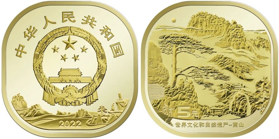 世界文化和自然遺產(chǎn)——黃山普通紀(jì)念幣正面圖案為中華人民共和國國徽,國徽上方刊“中華人民共和國”國名,下方為裝飾風(fēng)格的黃山圖案并刊年號(hào)“2022”字樣;背面主景圖案為迎客松和黃山山峰等,主景圖案下方刊“世界文化和自然遺產(chǎn)——黃山”字樣和面額“5元”字樣。