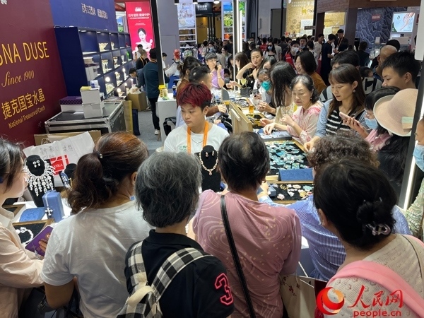 參觀者在第三屆消博會現(xiàn)場選購商品。人民網(wǎng)記者 張力洋攝