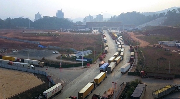磨憨口岸新貨運(yùn)通道前,貨運(yùn)卡車排起長(zhǎng)龍。