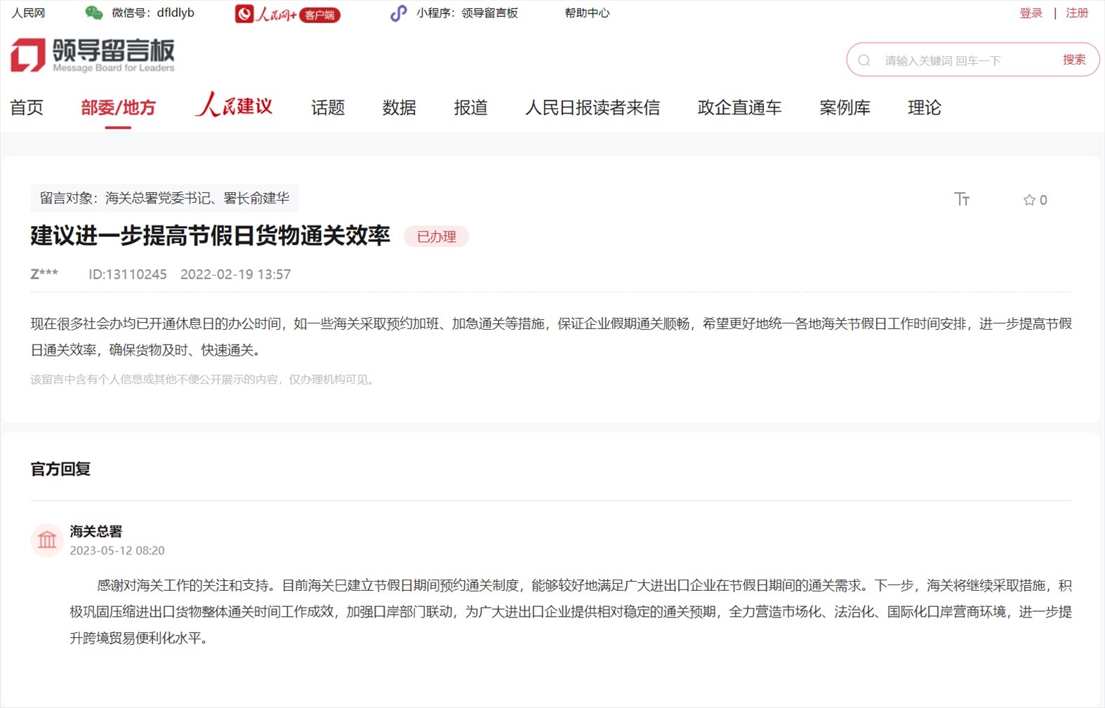 近日,網(wǎng)友通過人民網(wǎng)“領(lǐng)導留言板”對全國海關(guān)積極建言獻策,包括外來物種入侵、進一步提高節(jié)假日貨物通關(guān)效率等方面。