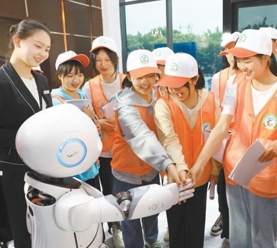 “數(shù)游峨眉”體驗中心,參加研學(xué)的學(xué)生與智能講解機器人互動。 峨眉山市融媒體中心供圖