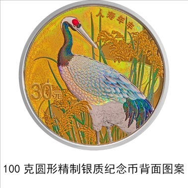 100克圓形銀質(zhì)“人壽年豐”紀念幣背面圖案為鶴、水稻等裝飾組合圖案,并刊“人壽年豐”字樣及面額。